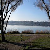 A U-turn revealed that there was a gate with a bypass for a bike onto an unpaved forest road. No wonder Garmin Mapsource had balked at routing me this way the night before when I was laying out the route. No matter, I rode along the bike path, passing some equestrains, and then found some thick leaves to ride through. These weren't wet, but riding through deep leaf-fall is an act of faith, since you can't see what's underneath it all. I kept my eyes on the trail looking for big rocks sticking out but had no issues until I came onto the Forest lake that had caused me to route in this fashion.