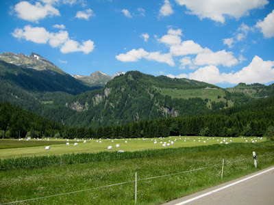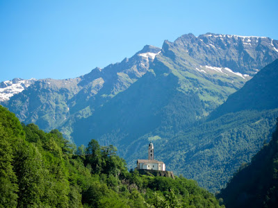 The road finally steepened at Soazza, where there were road side rest rooms as well as views of a church high in the hills. At Mesocco, we stopped at a grocery store for lunch as well as to load up on groceries and ice cream. There were several fountains between Soazza and Mesocco, but somehow Cynthia and Kekoa had managed to not see any of them. After lunch, we rode up the cobblestone road and saw the road develop significant grades of 10% or more as we climbed one switchback after another.