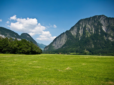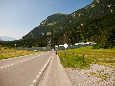 After Lisa was done touring the Heidi haus, and taking photos of the Heidi chicken coop and the Heidi goat field, we headed over to the Heidi weg, and began riding towards Liechtenstein. The pass turned out to be only 700m tall, and since we were already at 650m, it was not a problem, other than the last 200m stretch being on a road that was in the process of being repaved, and hence in a state of pure gravel. The descent into Liechtenstein took us past a Swiss military installation (I doubt if the Swiss really are worried about invasion from a country with less population than Saratoga, California, but nevertheless, it was a pretty impressive installation), and then zipped down to the valley into Balzers.