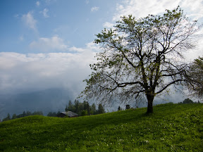 In Grindelwald, we stopped at the supermarket for a grocery store lunch, and Cynthia went into the Montbell shop to buy more clothing since she was still cold from the descent. After lunch, we descended to the junction and then headed over to Lauterbrunnen on the bike path, which was mostly rideable dirt, but was a change from the road I had used in the 2007 tour. In Lauterbrunnen we tried to get lodging but everything was full except for 2 places, one of which looked unacceptably bad, and the other had the owner telling us that it was too noisy for us to want to stay there. Neither Cynthia nor Kekoa was interested in seeing the falls, so we turned around and headed down into Interlaken, where the tourist information got us lodging at Goldswil, since I didn't want to be in town.
