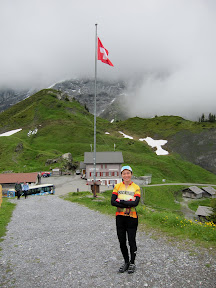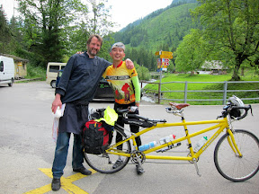 We quickly rode up to Kalterbrunnen and then into Rosenlaui valley, where we saw gorgeous views of the surrounds, but unfortunately Rosenlaui Glacier was shrouded by fog. At Hotel Rosenlaui where I wasn't planning to stop, I spied Andreas Kerhli, the owner, and shouted out his name. I stopped the tandem, hopped off, and we shook hands. I'd been to Hotel Rosenlaui in 2003, 2007, and 2008, each time bringing more and more people with us. Our reservations were for July 4th and 5th, and I asked if we could get them for tonight instead, and Andreas shook his head sadly. "We are so busy this summer! Hey, can I offer you tea or coffee?" "We could use some tea. It's cold!" "Yes, but the weather will change soon. It's coming. Hang on a minute." He soon brought out some tea but refused to accept payment for it.