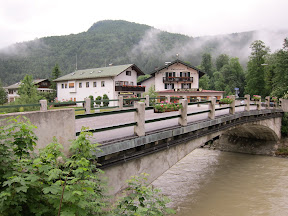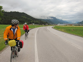 After an unusually hearty breakfast for such a reasonably priced B&B, we left at around 9:00am. As Cynthia expressed surprise at the low cost of the accomodations, I told her that this was what happened once you got out of touristy areas, even in expensive countries like Germany. A drizzle set in as we rode out of Kreuth, forcing us to stop to put on rain gear. The map marked a 12% grade riding over Achenpass, but it turned out that the 12% grade was really on the descent, since we did not encounter any significant steep grades on the climb.