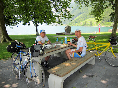 The ride towards Wallensee from Sargans was surprisingly pretty, with views of tall mountains all around us, little streams, and shady roads that were a relief in the warm summer sun. In Wallenstadt the bike path suddenly petered out, but we wanted lunch anyway, so headed into town where we bought a grocery store lunch. I asked the information center, which was conveniently located right at the post office where an internet cafe was, since Lisa wanted to do some business on the internet. They pointed me at a Cafe which was right on the water of the Wallensee, and when we got there it looked like an ideal picnic spot, so Phil and I laid the bikes down and proceeded to lunch on the benches while watching the beautiful scenery.