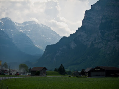 Indeed, it started raining heavily in Linthal itself. We pulled into a bed and breakfast, the but beds looked so moth-eaten that I didn't even want to bother with a bed bug check. The train station had a hotel that was frequented by cyclists, but the room she wanted to give us had a bathroom that reeked, so we ended up on the other side of town at Hotel Adler.