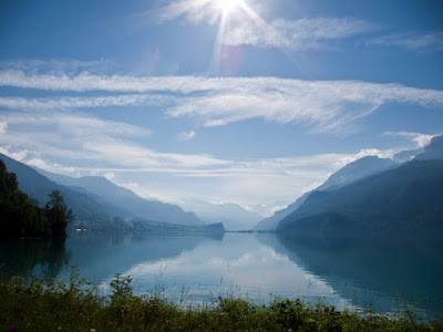 The morning greeted us with beautiful sunshine and calm wind. It was still cool, but that was OK, because we were to climb Grimsel pass today, making for a very long day. But first, the approach. The road rose gently at first, and then dropped rapidly down along the Brienzersee's South side. The official bike route goes around the North side of the Brienzersee, but Jobst had always gone around the South side, and this was my chance to see why: the road while lacking bike lanes, is quiet, and unlike the North side which is frequently cluttered with vegetation and trees, granted us clear views across the lake towards the high mountains. In the cool morning air with calm winds, the lake took on a highly reflective surface, looking like a magic mirror as we rode by, fast, quiet, and smooth.