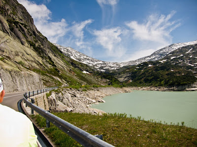 Grimsel pass is the least pretty of the major Swiss passes. What that means is that it's far better looking than any of the roads in the Sierras, and probably in the continental US. In the lower regions, it winds along bucolic farms and pretty houses (no MacMansions here!), alongside a running stream and river. In the middle section, it runs along waterfalls, gorges, and places where Canyoning is allowed. Nearly every tunnel has a bikeable bypass, including one which is almost a kilometer long with hand-laid cobbles (I know it was hand-laid because when Lisa and I last came by in 2003 we saw workers hand-laying them!). In the upper section it has no less than 3 reservoirs, each cascading into the other, generating clean power for the region. This accounts for the unsightly power-lines and pylons which you see all the way up the road.