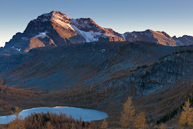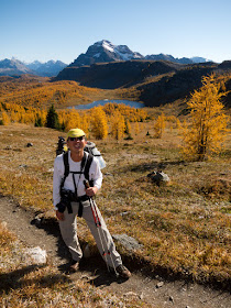 I drove down to the Sunshine ski area, and started packing for my trip. No tent was necessary, but I still needed my sleeping bag and sleeping pad. I packed food, stove, fuel, and long underwear. For camera gear, since I did not want to lose more than a day of shooting, I brought my 5D2, my tripod, my ND grad. filters, a polarizer, some spare memory cards, a cleaning kit for the lens, and just one lens. The backup camera was of course the S90. Laden down with gear meant that I needed both hiking sticks, and I had been told to bring boots for the muddy section. It took me most of an hour to pack all this gear out of the mess that was the back of my mini-van, but now I was ready to go. I hopped onto the shuttle bus after paying the $15 one way fee. The bus ride was surprisingly long for such a short distance, but the women behind me were experienced hikers in the area, and told me that the larch forests this time of year were really pretty and I would be surrounded by them. "Egypt Lake is just a place to stay. The highlight is Healy Pass."