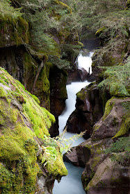 I looked at the scene and decided that sticking around hoping for the sun to poke through with good light was futile, so I turned around and hiked out. As I hiked back down, I ran into a photographer who had just come from East Glacier. He told me that on that side, the road was open all the way to Logan's pass. Even though it was a long drive in terms of distance, it only took him two and a half hours, since most of the roads were rated for 70mph or faster. That made my decision to visit the East side of the park easy. I hiked rapidly down, slowing only to shoot the the river at a particularly pretty spot, and the gorge.