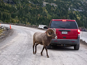 There was quite a bit of construction on the road, and about 12 miles in we had to stop and wait for a pilot car to lead us to the top, since there was only one lane of road available for both directions. This turned out to be a good thing, since stopped cars attract big horned sheep, which came close enough for my point and shoot to capture. I realized at that point that keeping my SLR in the trunk of the car was a mistake.