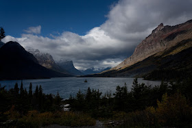 I got in about 10 shots before the rainbow faded. Noting that it was still raining, I checked the time and saw that it was 10:30am when the rainbow faded. In the hopes of getting dramatic scenery, I drove further up the road to the Goose Island overlook. The clouds there looked dramatic, but the best light was gone, so I took a few pictures and left for Many Glacier.