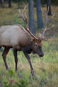 I arrived at Jasper at 5:00pm. Hien worked there, and had offered me a shower if I showed up, but when I called her while filling up my car, there was no answer. I really wanted a shower, so I headed over to the Whistlers youth hostel right outside Jasper, picking up a hitch-hiker while going there. It turned out that I was lucky to arrive at the hostel when I did: they were running a special where you got one night free stay if you signed for the membership. The cost of the membership was $25.70, $0.50 more than the cost of a night's stay. Well, my mom didn't raise no dummies, so I quickly signed up to be a member and got my night's stay. I quickly made dinner, and then ran out hoping to get sunset shots. Maligne Canyon was supposed to be good, but on the way there I got distracted by Elk walking around right along the road outside Jasper.