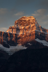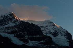 I was pretty tired from one already strenuous hike that day, but that meant that my pace would be similar to what I could manage in the dark. I started the hike in shadow but after about 40 minutes made it to the ridge of the pass. From the ridge I could tell that it would be a long walk to get to the mountain in front of the ice field, but furthermore, from a photographic point of view, it would not be necessary. The big glaciers were right in front of the Wilcox Pass trail, and with a telephoto I could reach all the areas that would be hit by Alpenglow. Even the ridge line in front of me could be useful, and not necessarily be a hindrance.