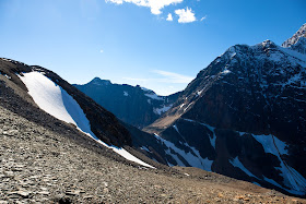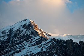 With that bit of responsibility done, I hiked back down to see what I could make of the fading light. As I drove past the ice-field, the remaining bit of evening light caught my eye and I drove to the ice field's parking lot and made several exposures with the mountains and snow against the changing light.