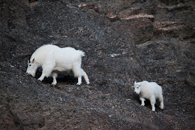 I kept driving into the twilight to verify that Wilcox pass was the best place to be. In photography, the amount of effort put into the photo has nothing to do with the results, and sometimes the road is a better place to shoot. I thought I had found a better place until I checked the compass and realized that it would be entirely back-lit by sunrise. So Wilcox pass it was. I decided against staying at Beauty Creek hostel: it had no power or showers, so I might as well camp out at the Wilcox Pass trailhead, which conveniently had a shower. On my way back there, however, I saw a pair of mountain goats, and snapped several shots with my 200mm wide open. The camera was set at ISO 3200, which meant that I would be lucky to get anything at all, but to my surprise my Canon once again came through with a shot that I would never have expected from my days of shooting chemical film.