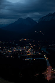 After dinner, I drove to Mt. Norquay in the hopes of getting a sunset, but the gray clouds were persistent. Hoping to make the best of a bad situation, I decided to aim for dusk shot of Banff.