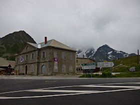 Sure enough, by the time we got to the top it was 5C and raining, though not horribly hard. We had climbed the gentle side of the Galibier, and would be descending the steep side with its 10% grade. I was cold, Phil looked cold, so the decision to get into the car and drive down was easy. I harbored thoughts of climbing Col Telegraphe, but it kept raining all through lunch and all the way up the Telegraphe as well, so I gave up on the idea and we drove to St. Michel Maurienne to find lodging. St. Michel was a non descript town with nothing to recommend it, but it gave us the choice of routes for the next day: Col De L'Iseran if the weather was good, and Col du Madelaine if the weather was iffy.