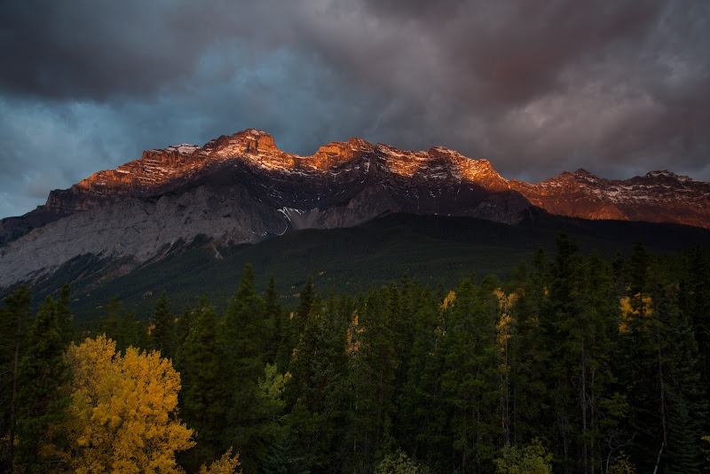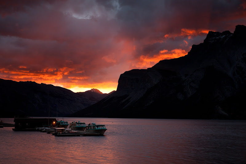 I was reminded of Lake Minnewanka, which had several signs pointing to it, and which Eungshin had mentioned the day before. I drove towards it and when I arrived, saw that another photographer had already staked out the place. The light was starting to look pretty good, so I quickly parked the car and ran out with my gear next to the photographer, who turned out to be Bill Wood.